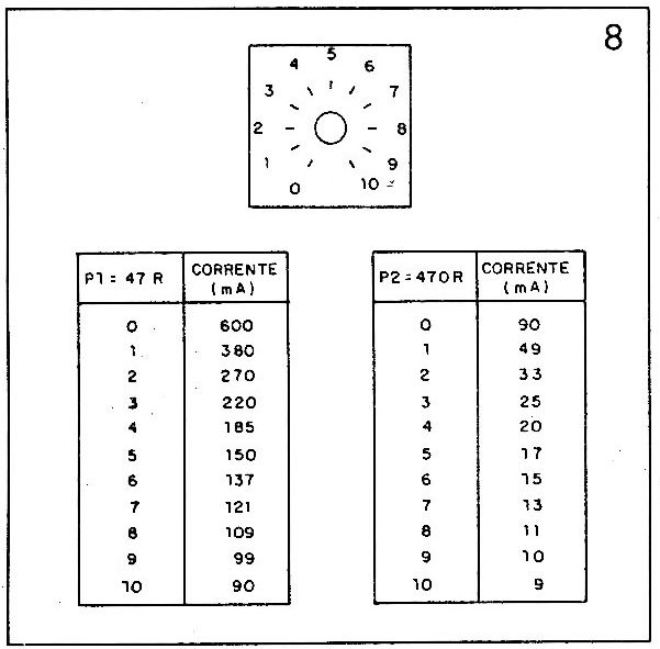 Os potenciômetros de ajustes de corrente devem ser de fio de 2 a 5W, pois através deles passará uma corrente de certa intensidade que tende a aquecê-los ligeiramente. Estes potenciômetros lineares serão dotados de escalas, sugeridas na figura 8.