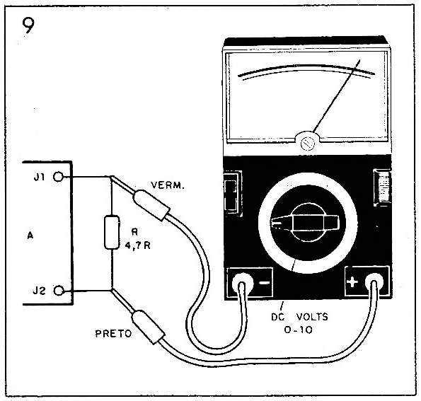 Para provar a fonte e até conferir sua escala você precisará de um multímetro comum e um resistor de 4,7 a 22Ω x 1W. Ligamos o resistor e o multímetro numa escala baixa de tensão, conforme; mostra a figura 9.