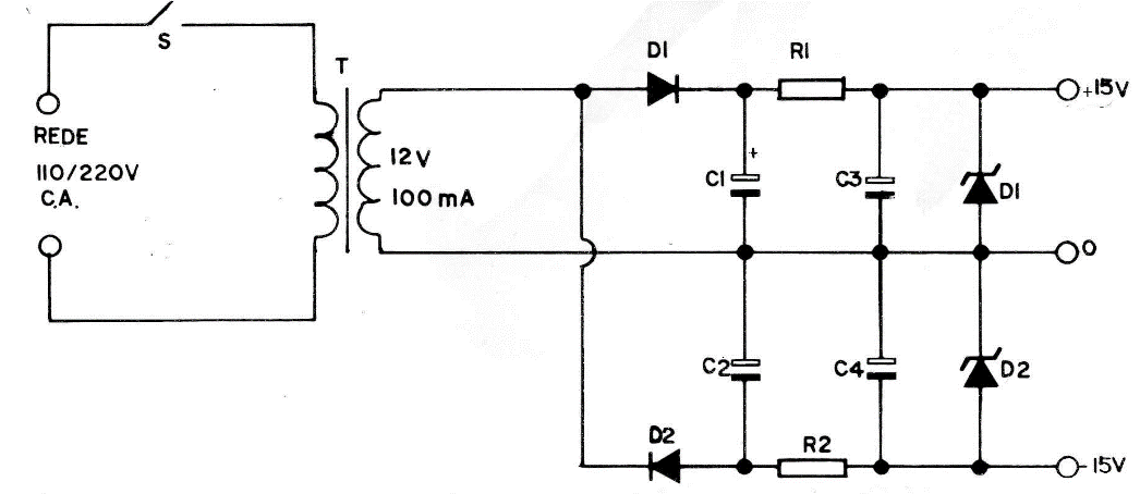 Os diodos zener de 1W asseguram a necessária regulagem do circuito, de modo a se obter uma tensão desejada de 15 volts na saída.