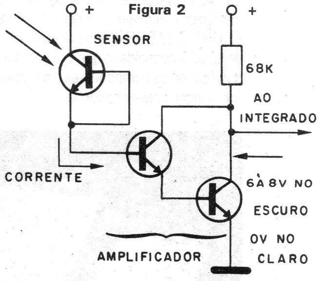 Uma pequena quantidade de luz que incida no foto transistor é suficiente para levar os dois transistores à plena condução fazendo com que a tensão de coletor do segundo transistor praticamente caia a zero, conforme mostra a figura 2.