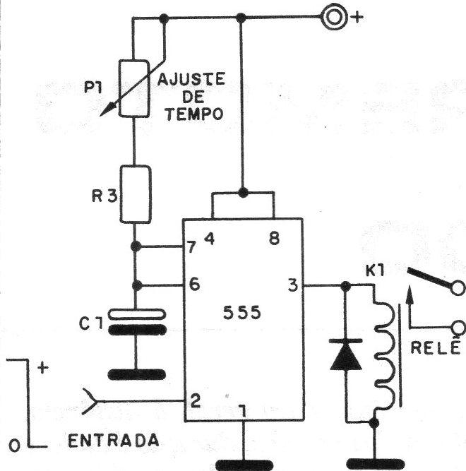 O disparo deste relê será feito por um tempo que dependerá tanto do valor do capacitor C1 como da resistência total apresentada por P1 e R3.