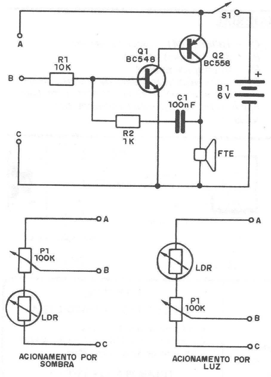 O elemento sensível é um LDR comum e a alimentação vem de apenas duas pilhas pequenas que terão enorme durabilidade em vista de seu baixo consumo.