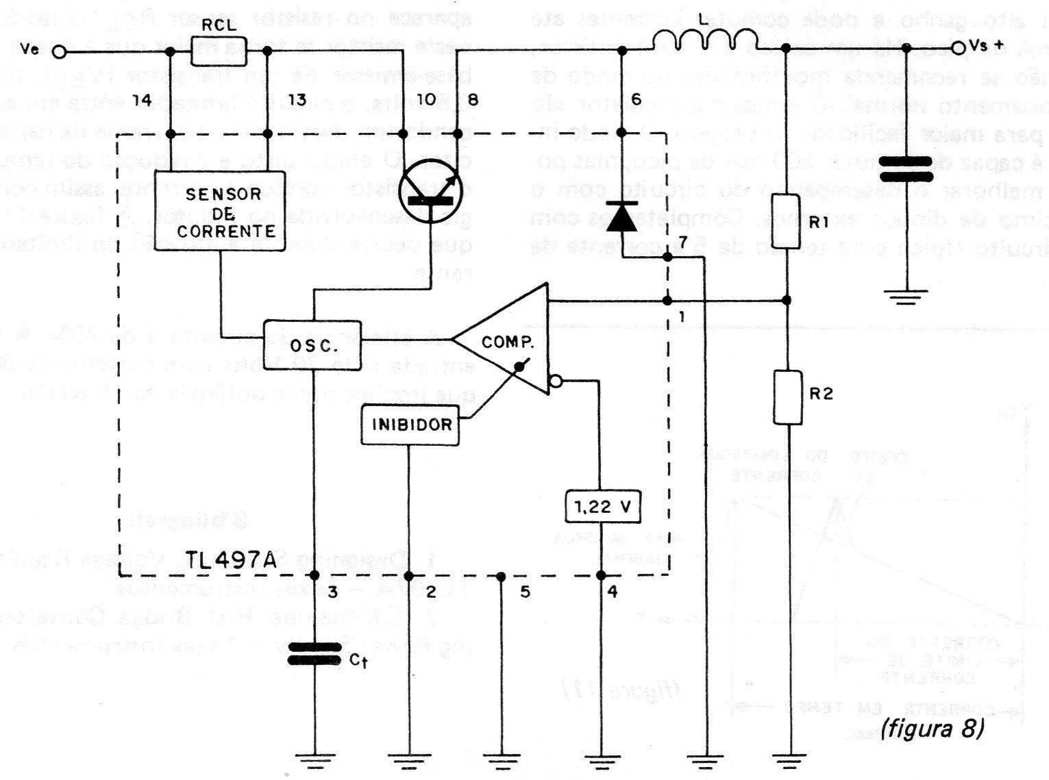 Na figura 8, temos o diagrama simplificado deste integrado, assim como dos componentes externos.