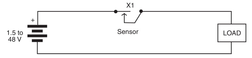 A maneira mais simples de usar um sensor mecânico feito em casa e normalmente aberto (NA) é mostrada na Figura 1. A carga (motor, lâmpada, circuito, solenoide, etc.) é colocada em série com o sensor. O projetista só precisa ter cuidado para manter a carga abaixo da capacidade máxima de corrente dos contatos do sensor.