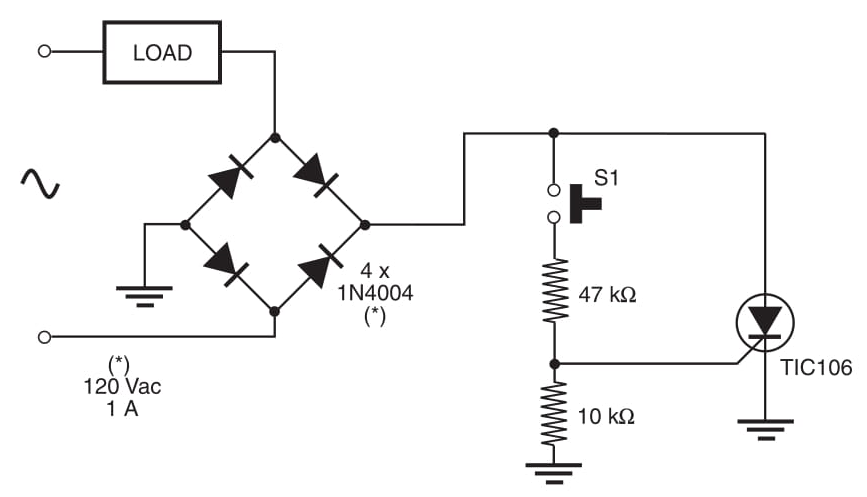 O circuito mostrado na Figura 1 é outra maneira de conectar a carga em um comutador de onda completa usando um SCR. O circuito opera da mesma maneira que o anterior.