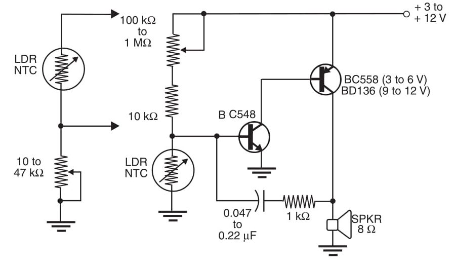 P1 e o sensor podem ser trocados para inverter a ação do circuito (isto é, é acionado pela escuridão ou quando a temperatura cai). Este circuito também opera com outros dispositivos resistivos, como sensores de toque e sensores de pressão.