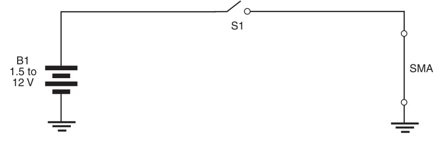 O circuito em bloco na Figura 1 ilustra a maneira mais simples de conduzir um SMA. A tensão deve ser calculada de acordo com o SMA (comprimento, corrente e resistência por metro) e a fonte de alimentação deve ser capaz de fornecer a corrente necessária.
