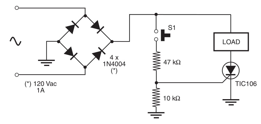 Este artigo foi escrito com base no meu livro Robótica, Mecatrônica e Inteligência Artificial - Robotics, Mechatronics and Artificial Intelligence (esgotado) publicado nos Estados Unidos. O circuito descrito pode ser usado para ligar e desligar cargas alimentadas pela rede elétrica CA. Este bloco elimina o inconveniente do Bloco 85 (perda de metade da potência), como mostrado na Fig. 1. A ponte completa na entrada permite a operação do SCR com ambos os semiciclos negativo e positivo da tensão da fonte de alimentação. Os diodos devem ser classificados para a tensão e a corrente exigidas pela carga. O interruptor pode ser substituído por um sensor.