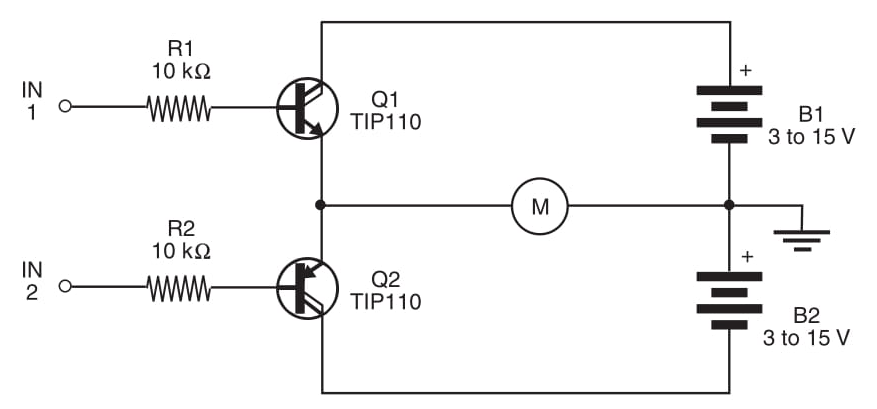 Menos potência é necessária para acionar o circuito mostrado na Figura 1, já que o transistor Darlington tem maior ganho. Este circuito precisa de correntes na faixa de microamperes para acionar motores com correntes de até alguns amperes, dependendo dos transistores. Em outros artigos, indicamos alguns transistores Darlington que podem ser usados neste aplicativo. O par TIP110 e TIP115 pode ser usado com motores de até 1 A. Nesse caso, a referência para os sinais de controle também é o terra. Um capacitor de 0,47 μF em paralelo com o motor pode ser necessário em alguns casos. Os transistores devem ser montados em dissipadores de calor. A tabela da lógica de controle fornecida no último bloco é válida para este bloco.