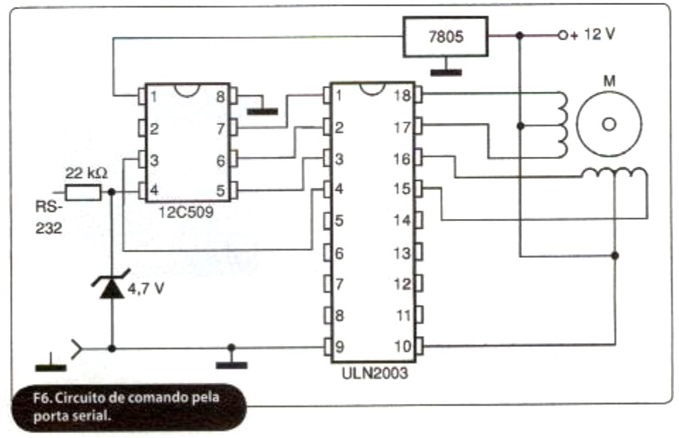 O circuito exibido na figura 6 possibilita o controle de um motor de passo pela porta serial de um PC (RS-232). Nesta aplicação temos a utilização do circuito integrado ULN2803 para o controle de potência com a capacidade de fornecer correntes de até 500 mA ao motor controlado.