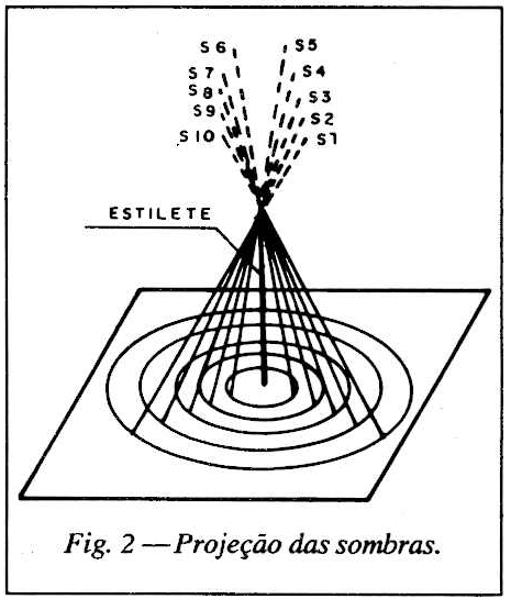 2 - Fixada a prancha conforme o descrito, estando o Sol limpo sem nenhuma nuvem no céu, vá observando a trajetória da ponta da sombra do estilete sobre a prancha. Quando a ponta da sombra tocar a primeira circunferência, marca-se um ponto neste local com um lápis. Continuando a observar a trajetória da sombra, vá marcando sobre todas as circunferências os novos pontos surgidos. Ver a fig. 2. Consultando o relógio, faltando 40 minutos para o meio-dia, vá marcando o extremo da sombra a cada 5 minutos ou tempo menor, como de 3 em 3 minutos. Esta marcação deverá ter uma simetria de tempo, isto é, começando a marcar faltando 40 minutos para meio-dia, continuar marcando até 40 minutos depois do meio-dia.