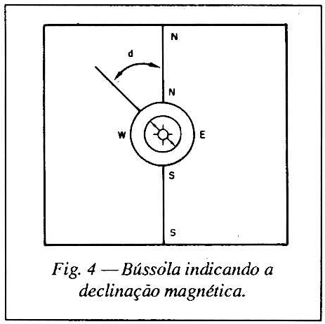 4 - Sobre esta reta AB, coloca-se uma bússola, cuja deflexão "d", mostrada na fig. 4 é a declinação magnética local, devendo anotar o seu valor como também a data (dia, mês e ano), pois a declinação magnética varia com o tempo.