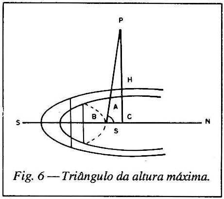 Para calcular a latitude local, tem o ângulo “a" da fig. 6, e algumas considerações muito importantes a serem feitas. Primeiro é a faixa loxodrômica que é limitada no hemisfério boreal pelo trópico de câncer e no hemisfério austral pelo trópico de Capricórnio.