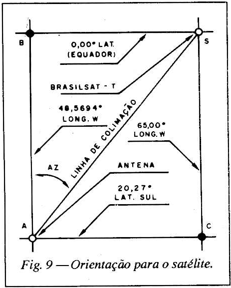 O comprimento de um arco de um grau é 111.111,03 metros, ver Fig. 8. Na revista SABER ELETRÔNICA n° 217, pág. 48, fig. 1, estão indicados dois satélites, um sobre o Equador Celeste e o outro no paralelo 45 graus sul. Ainda na mesma revista, consultando a Tab. I, pag 49, encontramos os satélites Brasilsat I e Brasilsat II, respectivamente 65 graus oeste e 70 graus oeste.
