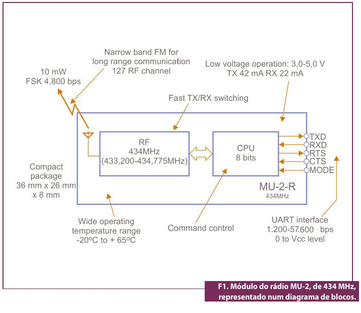 As figuras 1 e 2 mostram o módulo do rádio MU-2, da Circuit Design. Esse módulo utiliza a interface UART, de modo que a conexão com a UART da CPU (RS-232C) é simples. O MU-2-R usa correção de erro nível 4 tipo Reed-Solomon reduzida [RS(40,32;4)]. Ele tem, também, um modo que combinado com interleaving (intercalação), aumenta a recuperação para 25% (10% sem interleaving). A figura 3 é uma imagem de osciloscópio do impacto de efeitos (múltiplas trajetórias), quando o MU-2 se move nas proximidades — em um modo sem correção de erro.