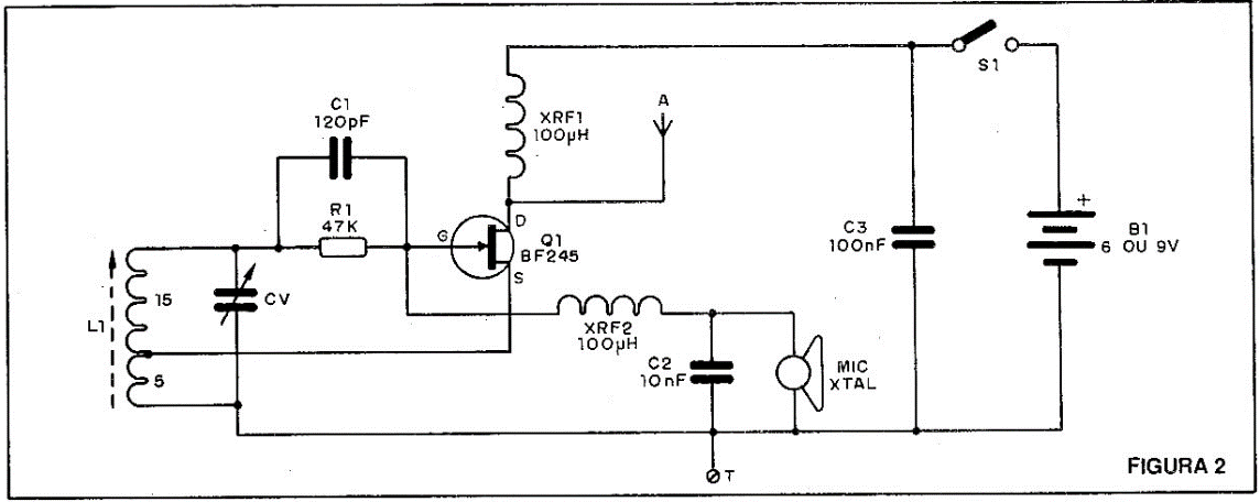 O transistor de efeito de campo usado é o BF245 e os choques de RF XRF1 e XRF2 são micro choques de 47µH a 100 µH. Como estes componentes não são críticos poderão ser improvisados, enrolando-se de 40 a 60 voltas de fio esmaltado fino (28 a 32AWG) num palito de fósforo ou de dentes.