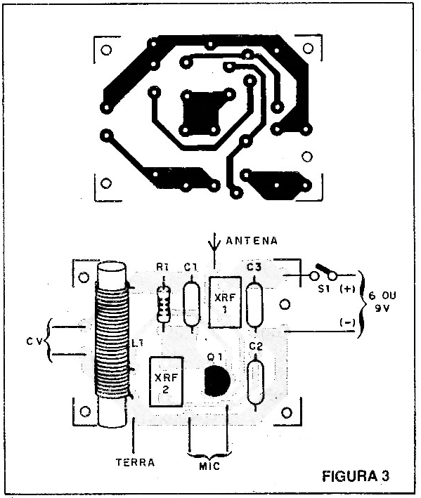 A montagem numa placa de circuito impresso é mostrada na figura 3. Damos também a versão em ponte de terminais (figura 4) para montadores menos experientes, já que não se trata de circuito crítico.
