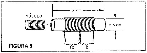 A bobina L1 consta de 5 voltas de fio 28AWG e depois mais 15 voltas do mesmo fio, num tubinho de 0,5cm de diâmetro dentro do qual exista um bastão de ferrite de 0,5 a .1cm de comprimento (figura 5).