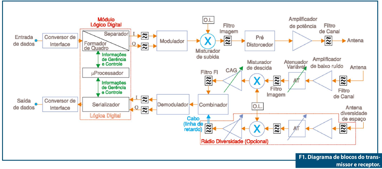 O receptor praticamente possui um diagrama de blocos na ordem inversa do transmissor. Outra diferença é que em alguns casos utiliza-se um segundo receptor (e uma segunda antena: "a antena diversidade de espaço") chamado "receptor diversidade" em rotas que possuem problemas de programação denominados "fading seletivos". Estes "fading seletivos" ocorrem quando o sinal transmitido é refletido em alguma superfície e atinge a antena receptora após algum atraso (por ter percorrido um caminho mais longo), conforme exemplifica a figura 16.