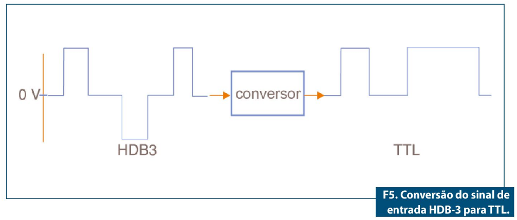 O rádio se conecta com outros equipamentos através da interface digital. Em telecomunicações esta interface é padronizada, podendo ter várias taxas de bits (2,34, 140, 155 Mb/s), tendo suas especificações descritas na recomendação G.703 do ITU — T. A figura 5 mostra um exemplo de conversão do sinal de entrada codificado em HDB — 3 para níveis TTL (circuito interno). Os níveis lógicos internos ao rádio são definidos exclusivamente pelo fabricante do equipamento.