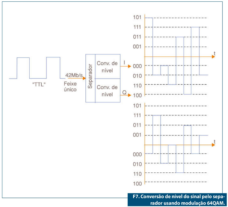 Também é função deste módulo o em-baralhamento dos bits ("scrambler"), o que garante o espalhamento espectral do sinal transmitido, independente do seu conteúdo. Finalmente, o separador de sinais divide o feixe de bits de maneira alternada em dois feixes, I e Q, e realiza a conversão de níveis do sinal conforme o esquema de modulação. Adotando neste exemplo a modulação 64 QAM, cada feixe (I ou Q) apresenta oito níveis diferentes de sinal, sendo quatro níveis positivos e quatro níveis negativos, cada nível representando três bits, sendo que níveis vizinhos diferem de apenas um bit. Veja a figura 7.