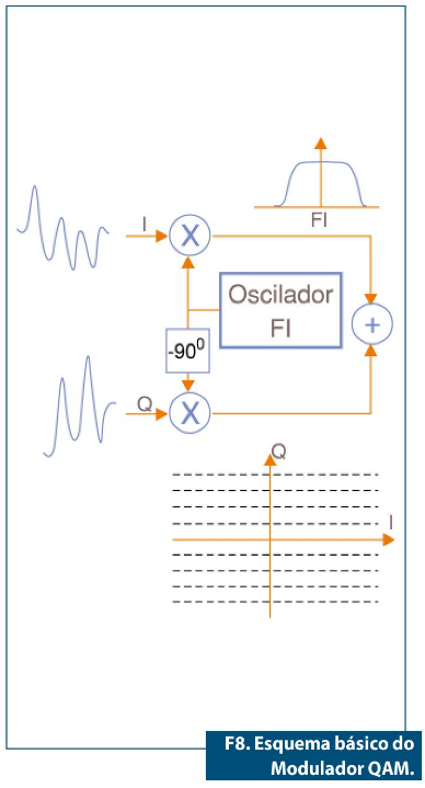 O esquema genérico de um modulador QAM está representado na figura 8. O oscilador de FI, na frequência de 70 MHz ou 140 MHz, é modulado em amplitude pelo feixe I, e o mesmo defasado de 90 graus é modulado pelo feixe Q. Estes dois sinais são somados, resultando na constelação de símbolos da modulação digital (figura 9).