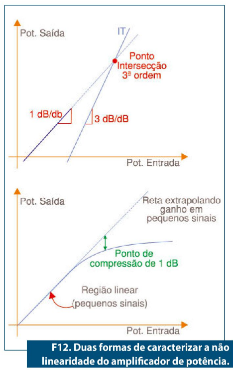 Há duas maneiras de se caracterizar a não linearidade de amplificadores: pelo ponto de intersecção de terceira ordem, ou pelo ponto de compressão de 1 dB do ganho (figura 12).