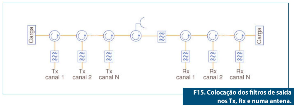 Este filtro possui duas funções: a primeira seria eliminar do sinal a ser irradiado qualquer espúrio ou sinal que possa causar interferência em outros canais, e a segunda seria permitir a combinação de sinais de diferentes rádios em diferentes frequências (canais de transmissão) em um mesmo guia de onda para serem transmitidos em uma mesma antena, conforme ilustra a figura 15.
