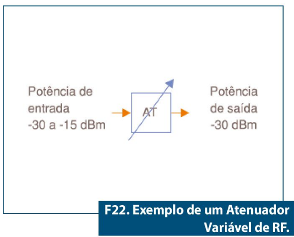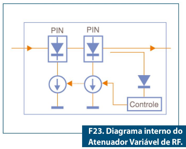 O atenuador variável de RF tem como função evitar que intermodulações ocorram no misturador de descida. Para executar essa tarefa, este estágio controla o seu nível máximo de saída, limitando-o em um valor definido em projeto, por exemplo — 30 dBm. (Figura 22). Internamente, um diodo detecta o nível de saída através de um acoplador direcional e um circuito de controle ajusta a corrente de polarização dos diodos PIN que atuam como atenuadores variáveis (figura 23).