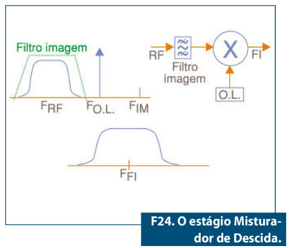 Este estágio é composto na realidade de três componentes: o misturador propriamente dito, o filtro imagem (que possui função semelhante à descrita no transmissor, porém, neste caso ele filtra o sinal antes do misturador) e o oscilador local, cuja frequência depende do canal a ser demodulado. Normalmente, são utilizados misturadores balanceados que apresentam boa rejeição de O.L e RF na saída de FI, porém há sempre um "vazamento". (Veja figura 24).