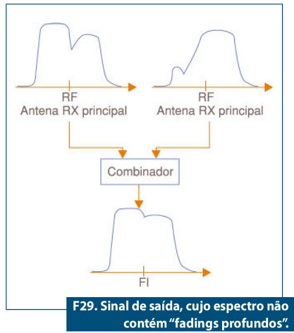 Para compensar a diferença de atraso entre os sinais (a antena-diversidade está numa altura menor e, portanto, mais próxima do rádio) é colocada uma linha de retardo, na realidade um cabo coaxial longo o suficiente, no circuito de diversidade para equalizar o atraso. Internamente o combinador possui um circuito que realiza também a equalização de fase antes de somar os dois sinais. Na saída se obtém um sinal com espectro sem "fadings profundos" (figura 29).