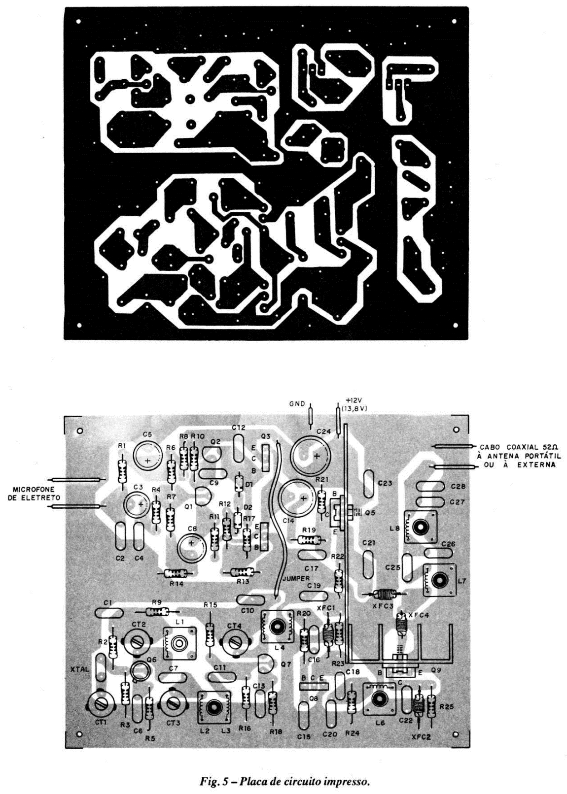 Observe que as etapas de amplificação de RF são todas sintonizadas o que exige do montador uma certa habilidade nos ajustes, para colocar o circuito em condições de fornecer a máxima potência de saída.