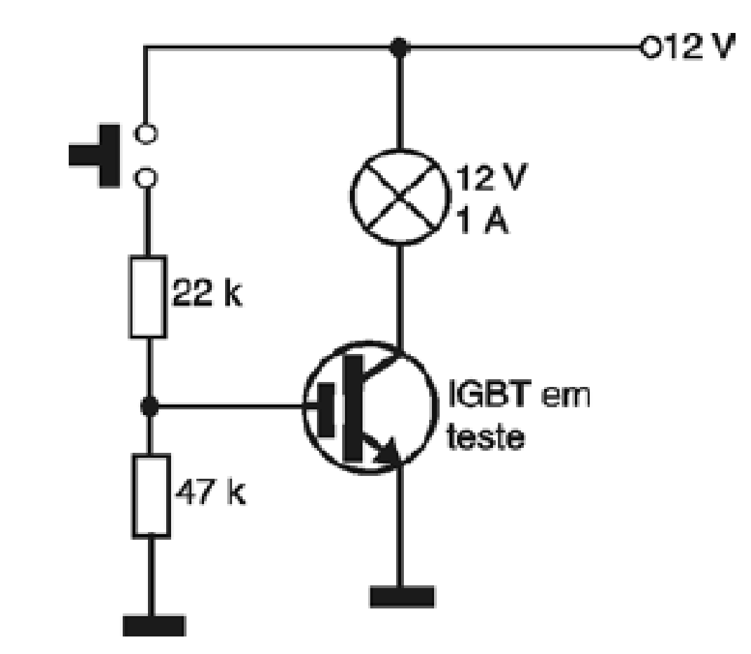 Ao colocar o IGBT no circuito a lâmpada permanece apagada. Ao pressionar S1 a lâmpada acende com brilho normal. Neste caso, podemos afirmar que o IGBT se encontra em bom estado. No entanto, se ao colocar o IGBT no circuito e ligá-lo, a lâmpada já acender, estamos diante de um componente em curto. Se o brilho da lâmpada for fraco, estaremos diante de um componente com fuga entre o coletor e o emissor.