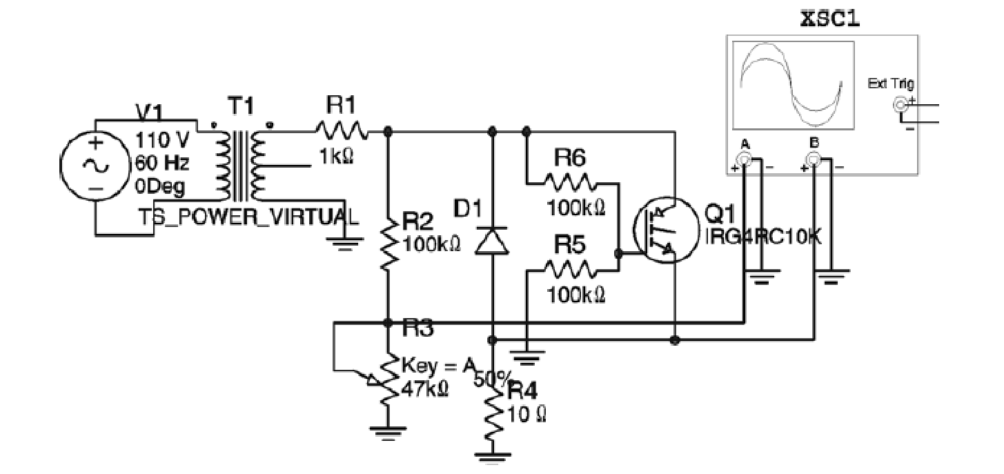Neste caso, o gerador de funções deve ser ajustado para produzir um sinal retangular com 50% de ciclo ativo em 1 kHz. Sua amplitude deve ser ajustada para 5 V, já que a maioria dos IGBTs trabalha excitado por fontes TTL ou outros tipos de circuitos lógicos digitais com tensão de saída dessa ordem.