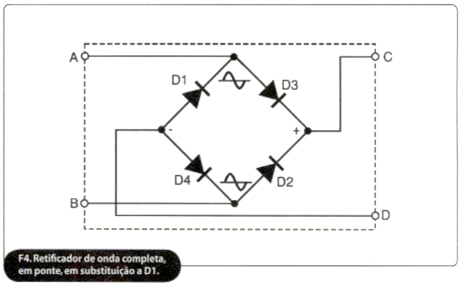 • Para conseguir-se um melhor rendimento na tensão contínua retificada, devemos substituir D1, figura 1, (retificador de meia onda) por quatro diodos em ponte, formando um retificador de onda completa, figura 4. Os diodos usados podem ser tanto de germânio (Ge), quanto de silício (Si) ou equivalentes, que suportem uma tensão reversa acima de 400 V e uma corrente direta acima de 0,5 A.