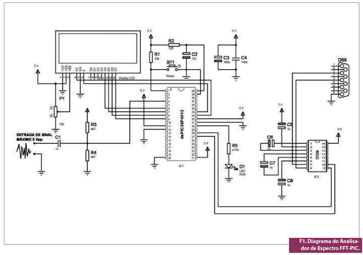 O circuito proposto faz uso de um microcontrolador e DSP (Controlador Digital de Sinal -DSC) dsPIC30F4013, que coleta um sinal na faixa de 0 a 3780 Hz, aplica a FFT, calcula a frequência de maior amplitude e mostra um gráfico com o espectro de frequência do sinal, com as 63 múltiplas harmônicas de 60 Hz. O programa faz uso da biblioteca "DSP Library" da Microchip, que possui os algoritmos necessários para a execução da FFT.