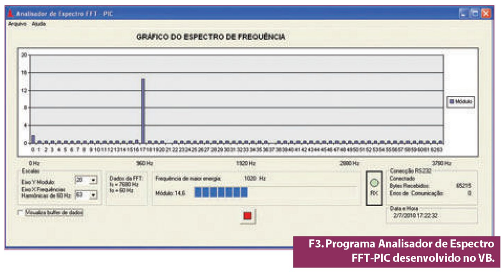 O programa inicia com a rotina Load_Form () que carrega o formulário e inicia o gráfico. Cada byte recebido pela serial chama o evento MSComm1_OnComm (). Quando o pacote de dados for recebido, a rotina carregavalorFFT () atualiza o gráfico com os novos valores recebidos dos espectros das frequências, numa escala de amplitude de 0 a 100, e a frequência de maior módulo. Uma caixa de texto permite visualizar os dados que são recebidos. Na figura 3 pode ser visto o programa com um sinal amostrado de 1020 Hz.
