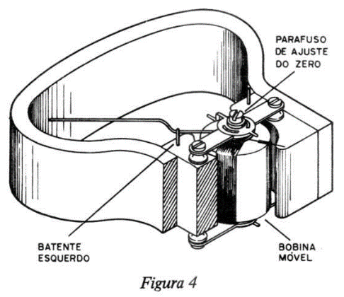 A corrente entra e sai na bobina pelos fios de suspensão. O momento que deflete o sistema indicador é produzido pela reação da corrente na bobina com o campo magnético no qual está suspenso.