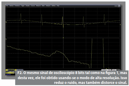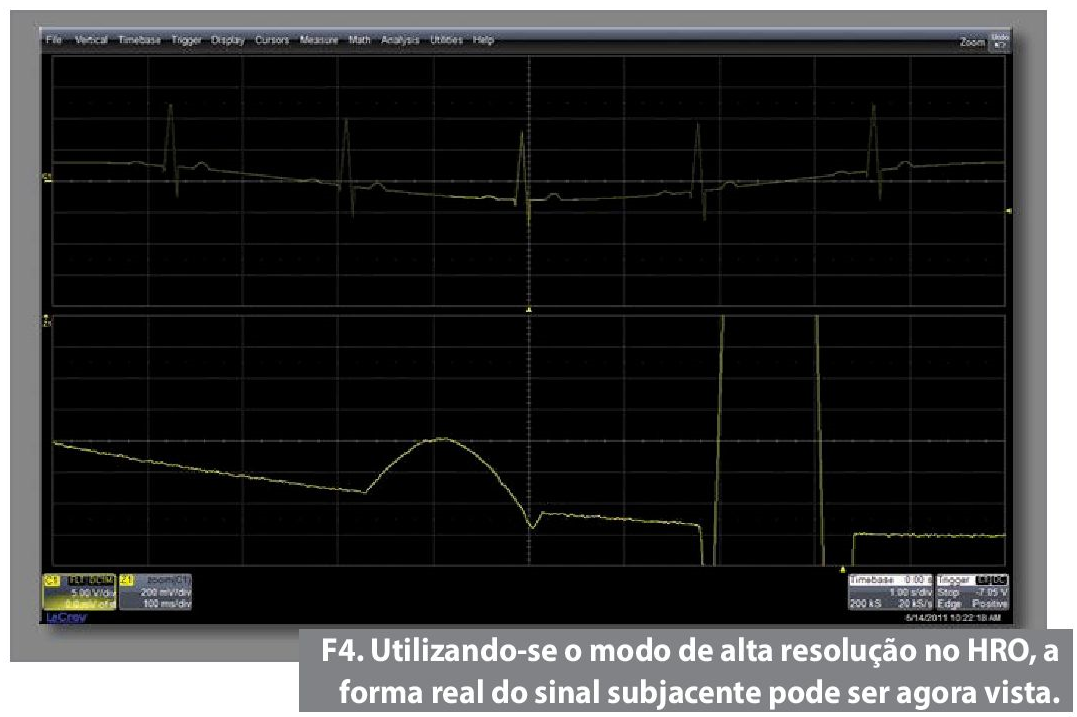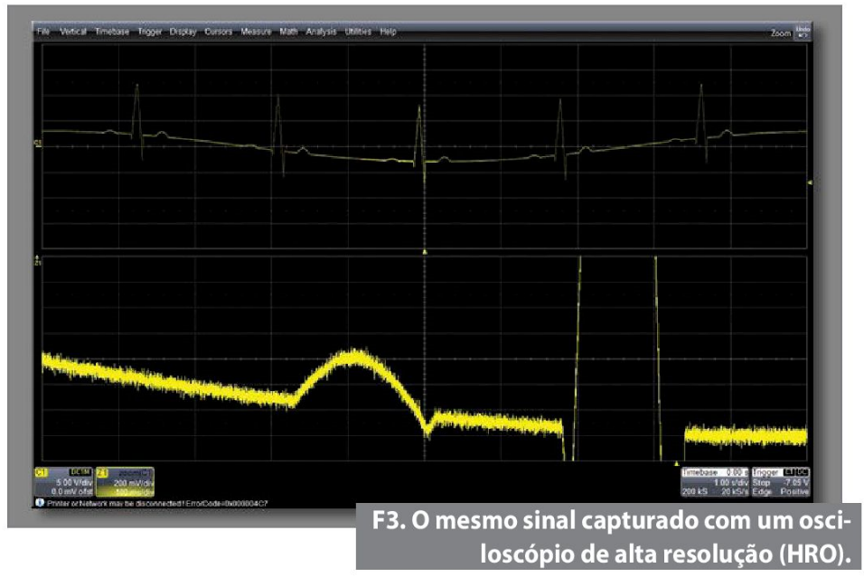 A figura 3 exibe o mesmo sinal captado, usando-se um osciloscópio digital mais preciso, um HRO (osciloscópio de alta resolução). Estes tipos de instrumentos têm amplificadores de ruído, os quais adicionam muito menos ruído ao sinal no processo de captura. Eles também captam o sinal utilizando ADCs de 12 bits (conversores analógico- digitais), em vez dos mais comuns ADCs da maioria dos osciloscópios de 8 bits.