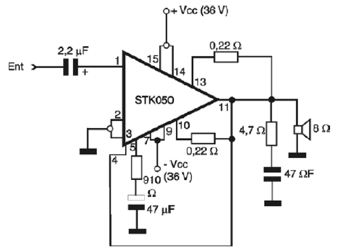 Os circuitos híbridos, como os da série STK (Sanyo, Sanken e outros) são dispositivos formados por circuitos integrados e pastilhas (chips) de componentes discretos como transistores de potência, montados numa base única e encerrados num invólucro como o da figura 1.