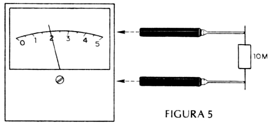 Temos finalmente no terceiro bloco o circuito medidor que é formado pelas pontas de prova sob alta tensão e pelo instrumento que indicará a passagem de qualquer corrente no isolante que estiver sendo testado. A sensibilidade do instrumento é excelente para o caso, pois mesmo uma resistência em série da ordem de 2M (2 000 000 de ohms) provoca deflexão total da agulha. Assim, uma resistência de isolamento de 10 000 000 de ohms (que já é bastante razoável) causará uma deflexão de apenas 20% da escala, conforme mostra a figura 5.